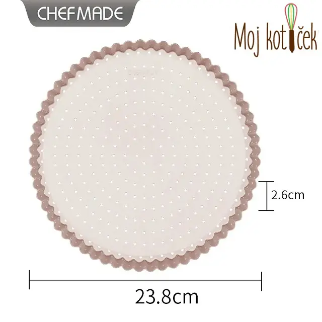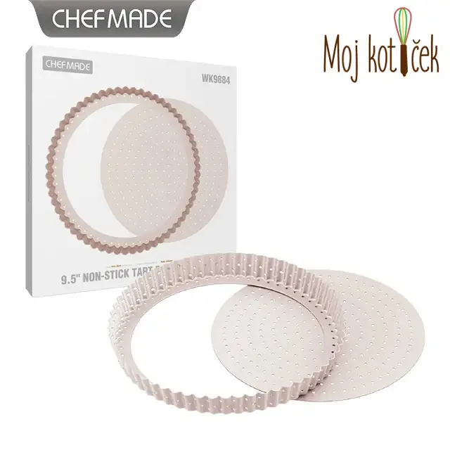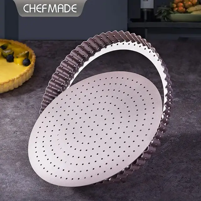 Backform für Kuchen, Quiches, Tarts usw. mit Perforationen für bessere Luftzirkulation und einem abnehmbaren Boden für einfaches Entfernen des Gebäcks. Premium-Qualität des renommierten Herstellers Chefmade! Hervorragende Chefmade-Qualität! In Champagnergoldfarbe aus hochwertigem Kohlenstoffstahl mit einer dreifachen Antihaftbeschichtung von SWITECH.