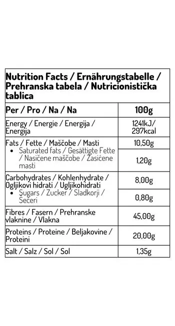 Weizenfasern, Reisfasern, Akazienfasern, Weizenproteine, Haferproteine, Reisproteine, Olivenöl, Hefe, Salz, Emulgator: Sonnenblumenlecithin, Mono- und Diglyceride von Fettsäuren. Hergestellt in einer Einrichtung, die auch Nüsse, Lupinen, Eier, Milch, Hafer, Weizen und Soja verarbeitet.