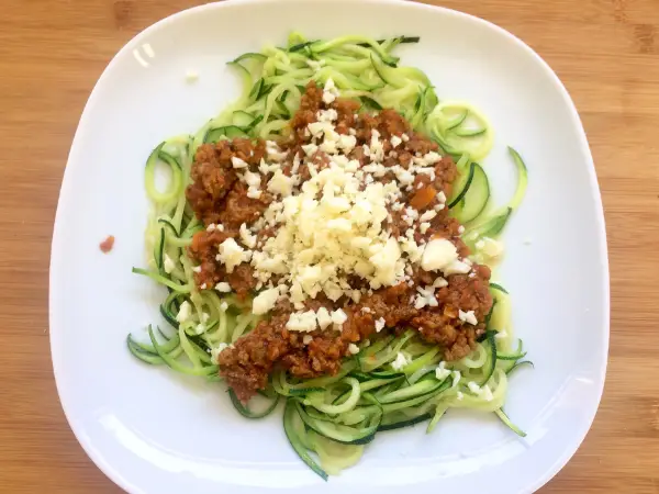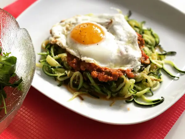 In der LCHF/KETO-Ernährung fallen alle Arten von klassischen Nudeln weg. Zucchini ist eine ideale Alternative zu Spaghetti, da sie einen milden Geschmack hat. Mit Hilfe eines Spiralizers (man kann auch eine normale Reibe verwenden, aber die Spaghetti werden nicht so dünn und lang) kann man eine gesunde Nudelalternative kreieren. Dieses Gericht ist auch perfekt für Diabetiker, da es einen extrem niedrigen glykämischen Index hat.