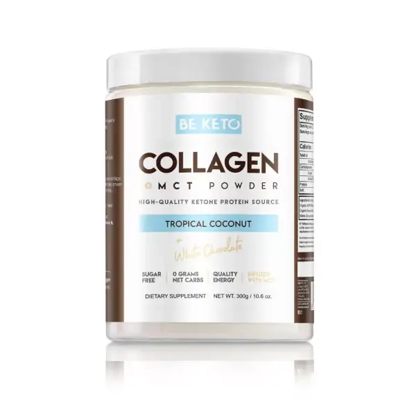 BeKETO collagen + MCT 300g, coconut/white chocolate Hydrolyzed grass-fed bovine collagen, organic MCT powder (source: coconut oil), organic erythritol, organic prebiotic fibers (acacia), natural coconut aroma, natural white chocolate flavor. Net quantity 300 g Nutrition facts in product photos.Usage