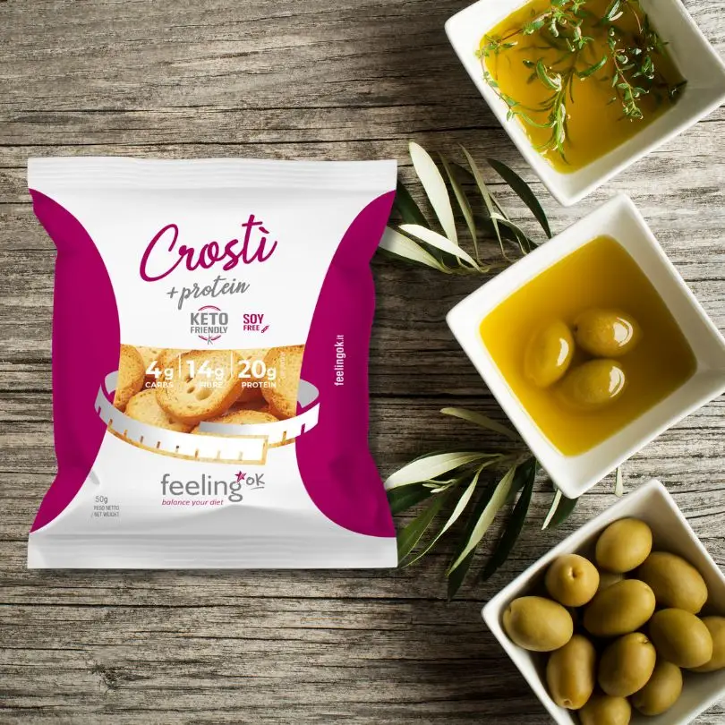 The small crunchy snacks, Crosti FeelingOK with olives, are ideal as an addition to various dishes, salads, soups, for spreads, charcuterie, or as a standalone snack anywhere. They have an extremely low carbohydrate content (4 g per 50 g portion packaging) and high protein (20 g) and fiber (14 g) content. Due to this unique composition, they are an ideal snack for those watching their carbohydrate intake, including diabetics, athletes, children, and the elderly. Packed in a convenient 50 g package, they can be taken anywhere.