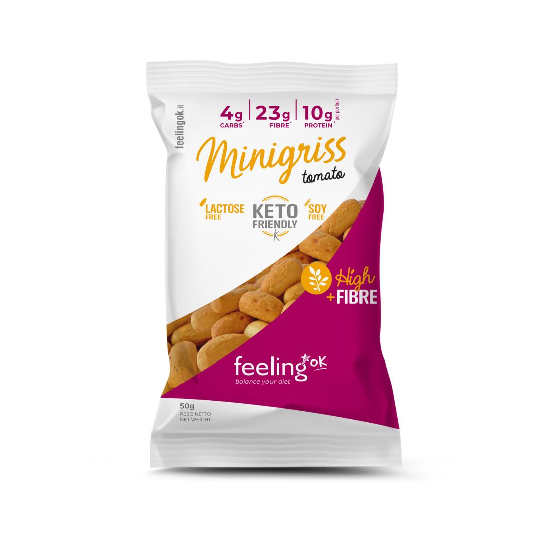 Mini grissini Minigriss FeelingOK with tomato will transport you to Italy with the first bite. In addition to their aromatic flavor, they are distinguished by their excellent composition. They have an extremely low carbohydrate content (4 g per 50 g portion packaging) and high protein (10 g) and fiber (23 g) content. Due to this unique composition, they are an ideal snack for those watching their carbohydrate intake, including diabetics, athletes, children, and the elderly. They pair perfectly with various spreads, prosciutto, cheese, or can be crushed and added to soups or salads. Even better, they are irresistible as a standalone snack, and you’ll find them disappearing too quickly. Packed in a convenient 50 g package, they can be taken anywhere.