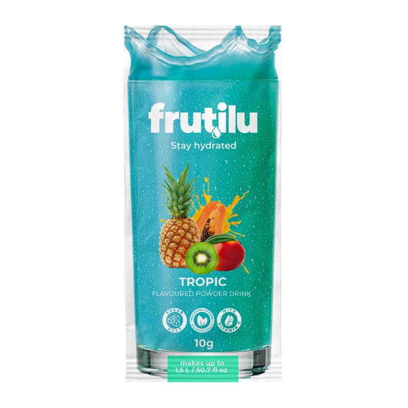 Frutilu instant drink powder with tropical fruit flavor. Sugar-free, with sweeteners, added vitamin C, aspartame-free. Makes up to 4 liters of drink. Low Carb product. Suitable for diabetics.
