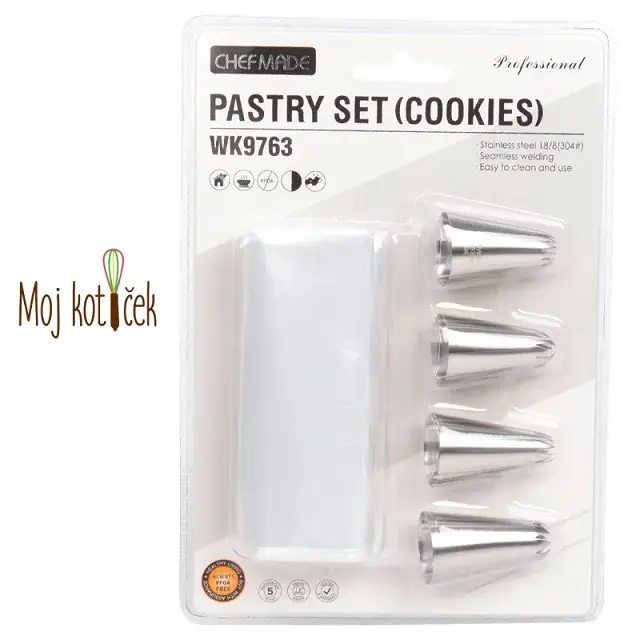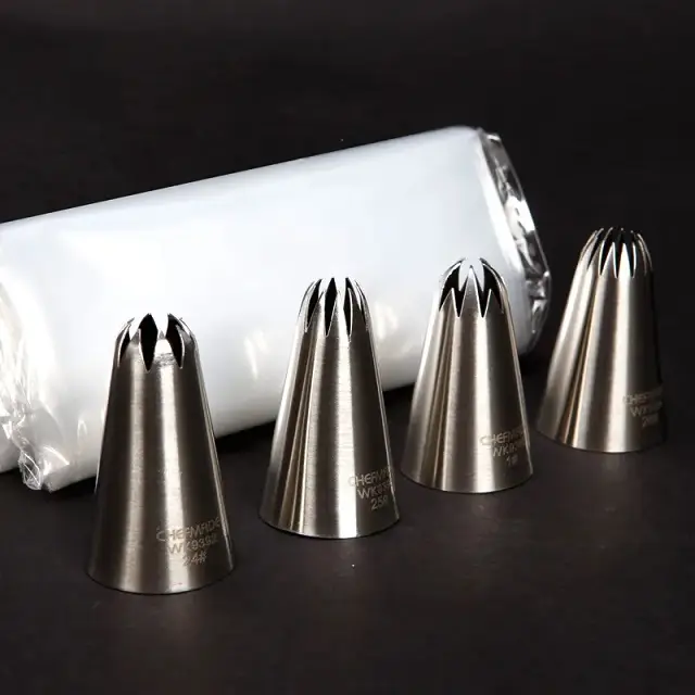 The set includes 4 different star-shaped nozzles for piping and disposable bags.