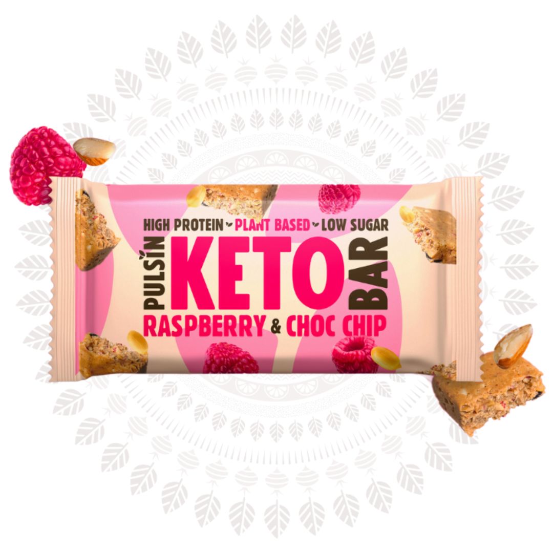 The Pulsin KETO Raspberry Bar with chocolate chips contains no added sugar, lactose, or gluten. It includes MCT oil and provides 12 g of protein per bar, making it an ideal snack for everyone – including diabetics, low carb and LCHF/KETO enthusiasts, athletes, and vegans. Available in various flavours.