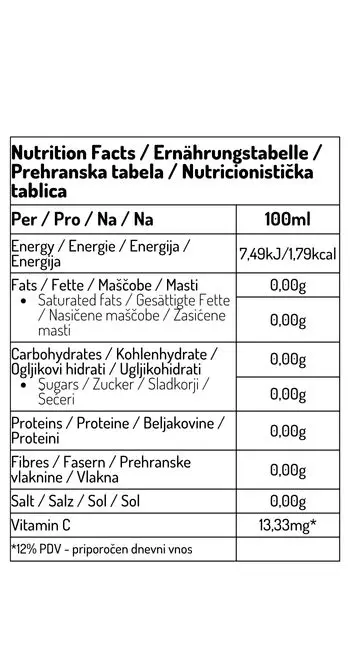 Regulator kiselosti: limunska kiselina; aroma; inulinska vlakna; kalcijev karbonat; sladila: sukraloza, steviol glikozid (ekstrakt stevije); bojilo: beta-karoten; askorbinska kiselina (vitamin C); zgušnjivač: guar guma. Može sadržavati tragove alergena: gluten, mlijeko i soja.