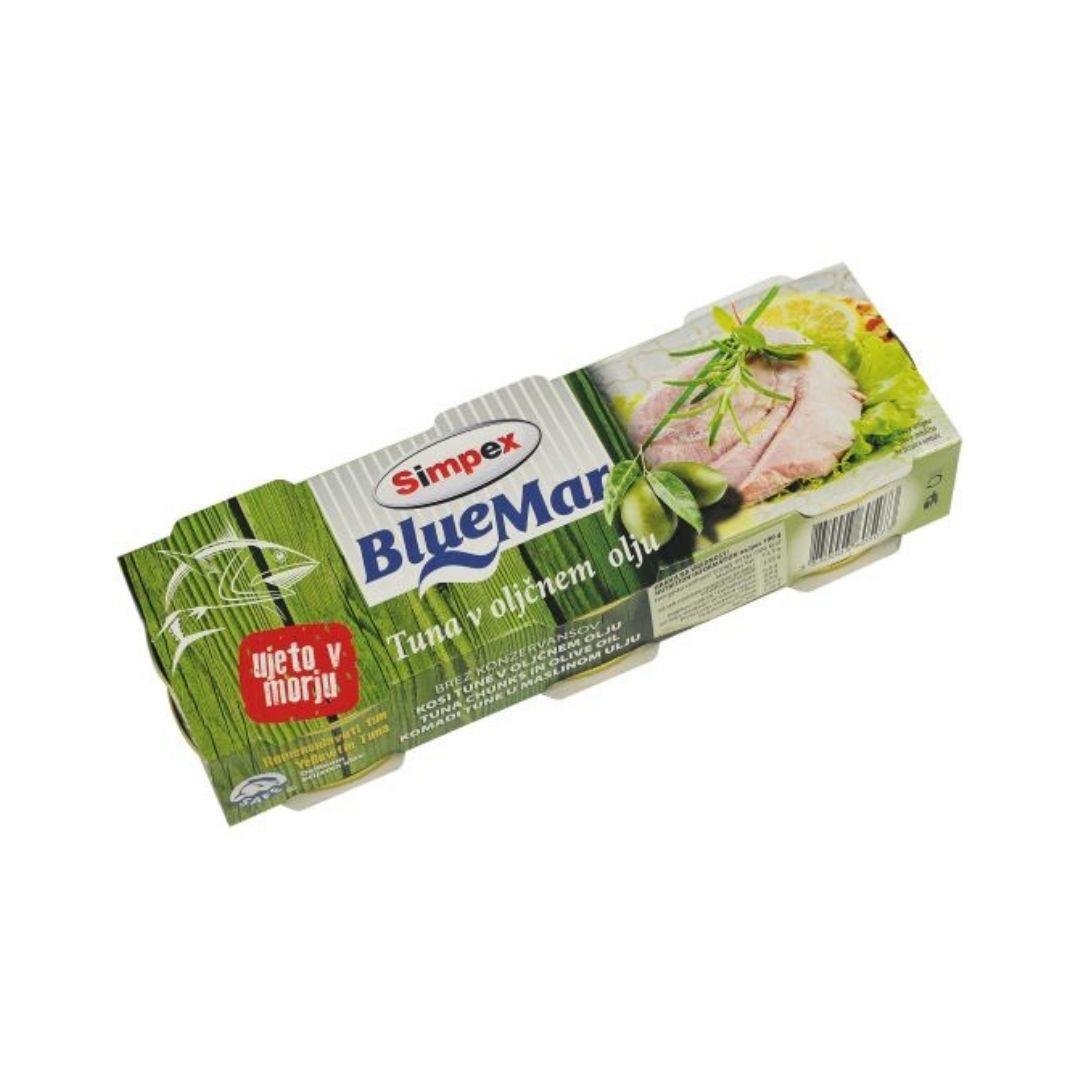 Komadići žutoperajne tune u maslinovom ulju BlueMar. Pakirano u praktičnim limenkama (neto količina 3 x 80 g / neto ocijeđena težina 3 x 52 g).