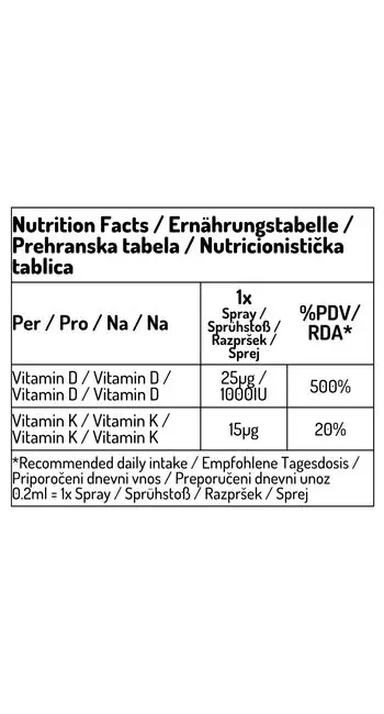 Valens D-plus je edinstveno prehransko dopolnilo v obliki ustnega pršila, ki vsebuje vitamina D3 in K2 naravnega izvora. Izdelek vsebuje naravno obliko vitamina D3 iz lanolina, identično tisti, ki jo s pomočjo sončnih žarkov sintetizira naše telo in za katero je dokazana dobra absorpcija. Vsebuje tudi vitamin K naravnega izvora (obliko menakinon MK-7), ki še dodatno prispeva k ohranjanju zdravih kosti in ima vlogo pri normalnem strjevanju krvi. BREZ želatine, sladkorja, umetnih barvil in arom ter brez glutena. Izdelek je primeren tudi za vegetarijance.
