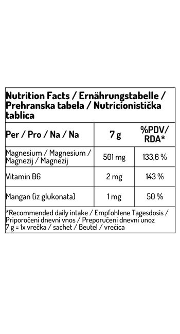 Sok plodov črnega ribeza (Ribes nigrum), magnezijev citrat, naravne arome, magnezijev malat, naravna sladila (steviol glikozidi iz stevie, ksilitol), magnezijev bisglicinat, sredstvo za uravnavanje kislosti (citronska kislina), barva (koncentrat rdeče pese), magnezijev taurat, magnezijev glukonat, magnezijev sukcinat, manganov glukonat, vitamin B6 (piridoksin hidroklorid).
