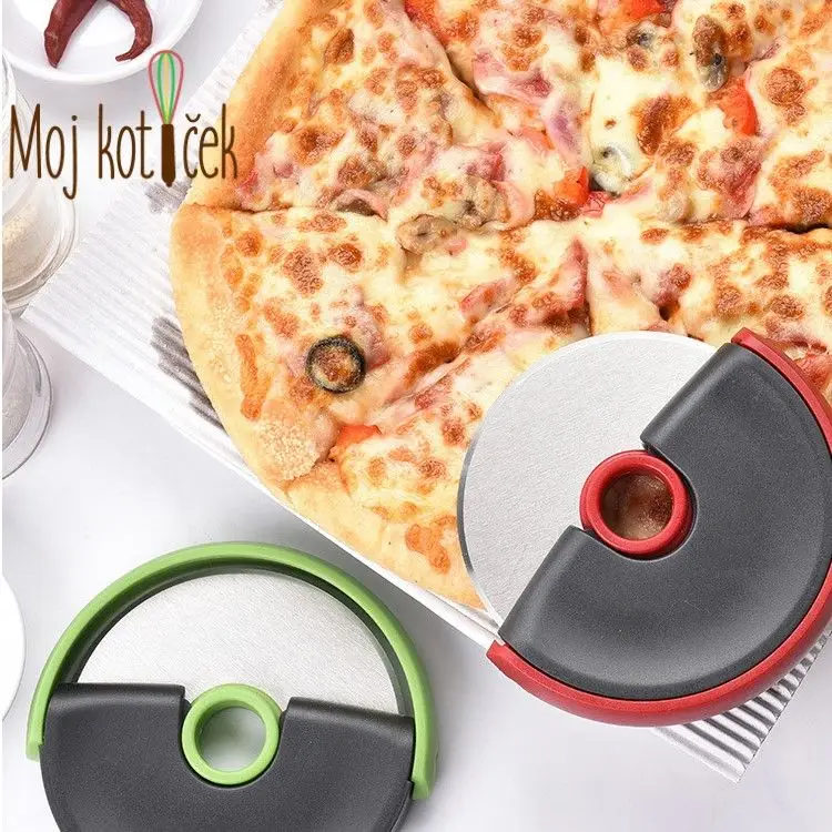 Kolešček z rezilom za rezanje pice. Za lažje čiščenje se rezilo sname z držala. Po uporabi pa se rezilo zapre z varnostnim pokrovom.