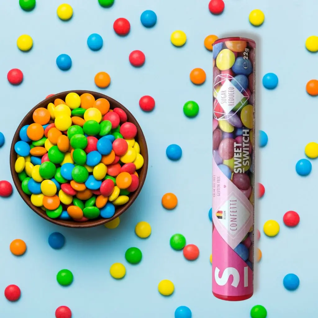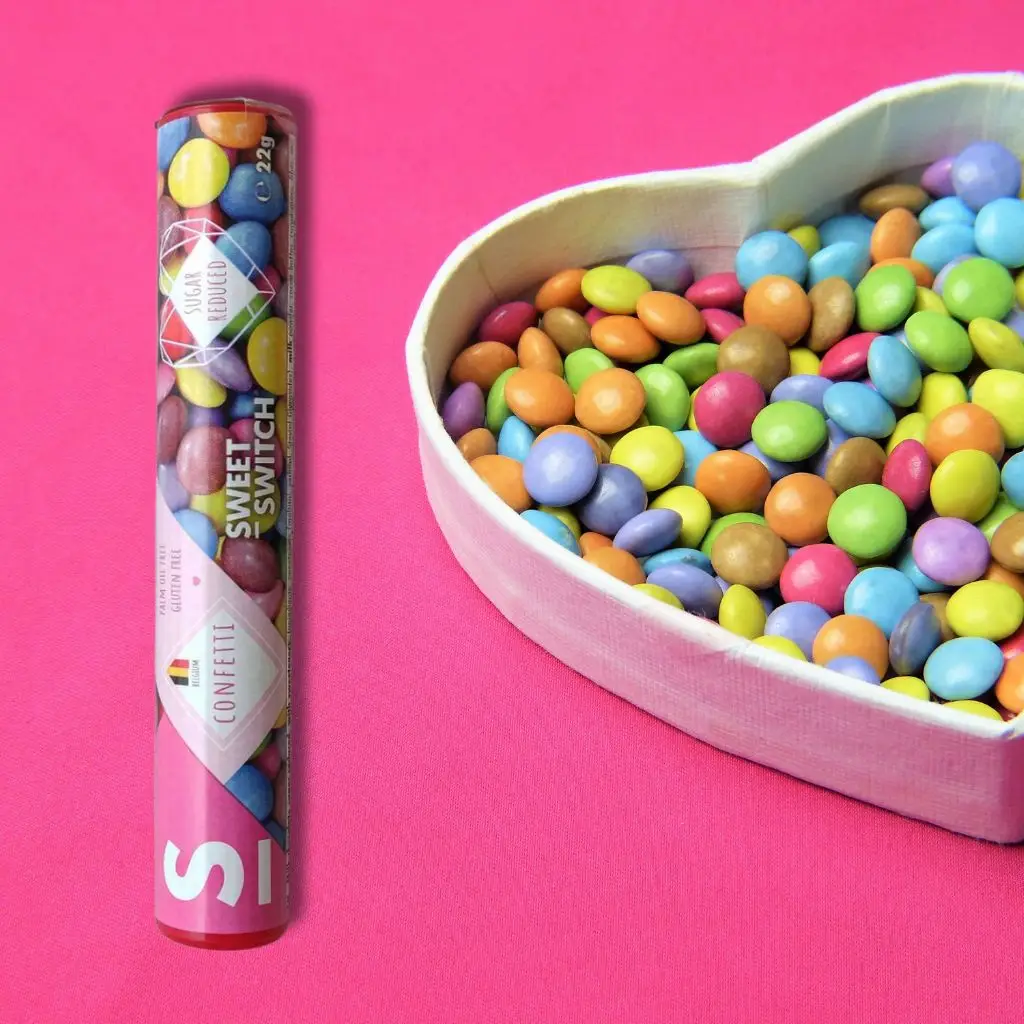 Odlični pisani čokoladni bonboni Sweet Switch ti bodo pričarali nasmeh na obraz! Odlikuje jih hrustljava barvita zunanjost in čokoladna notranjost. Pakirani so v priročno embalažo, ki te lahko spremlja kjerkoli. So brez glutena, brez umetnih barvil in brez dodanega sladkorja. Celotno pakiranje (22 g) vsebuje samo 1,3 g naravno prisotnih sladkorjev, zato je idealen izbor tudi za diabetike in vse, ki v svoji prehrani omejujete sladkor.