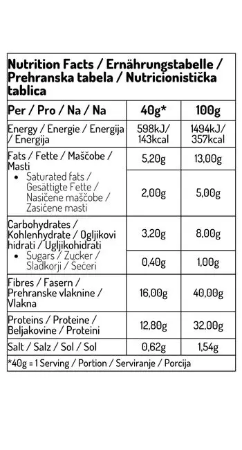 Pšenične vlaknine, pšenične beljakovine, ovsene beljakovine, jajčni beljak (5%), laneno seme, sezamova semena, olivno olje, sol, naravni kvas, emulgator: sončnični lecitin. Proizvedeno v obratu, kjer se uporabljajo tudi oreščki, volčji bob, jajca, mleko, oves, pšenica in soja.