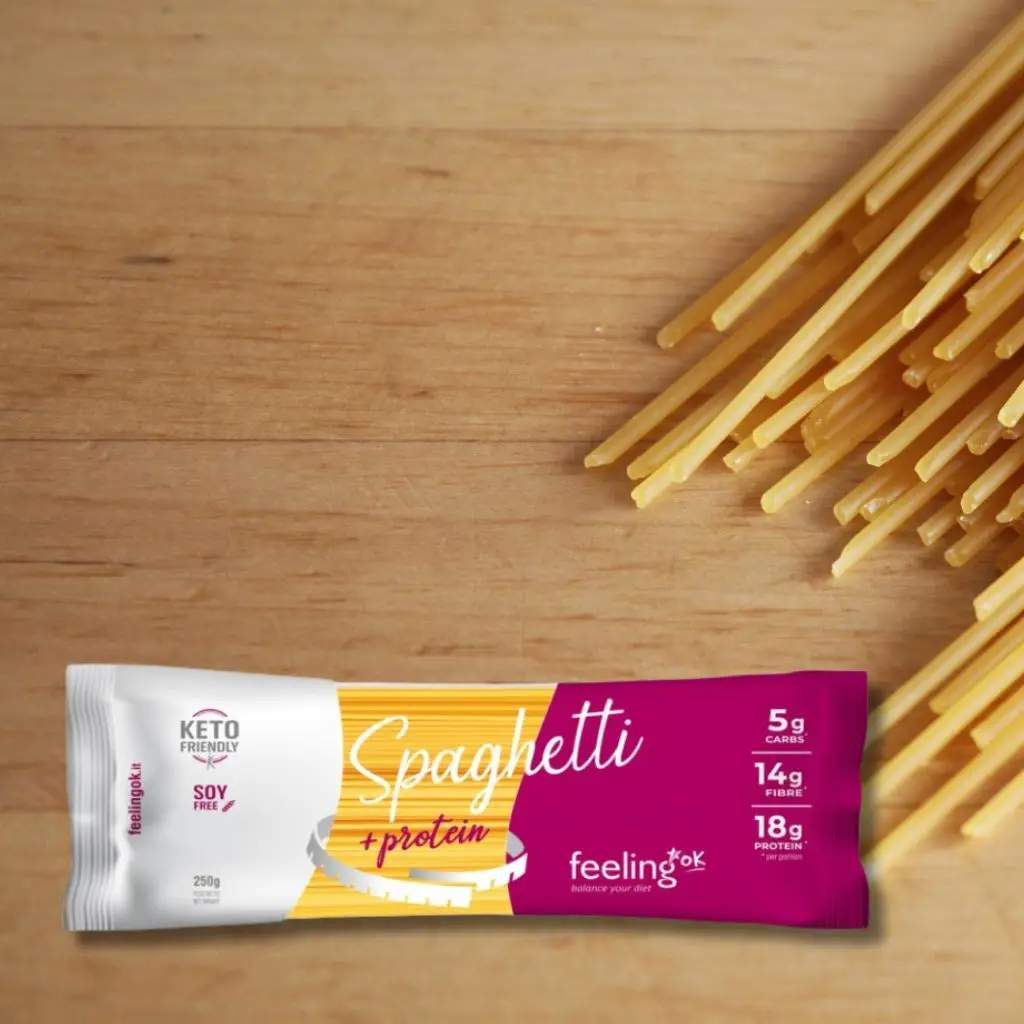 Se izogibaš hidratom v svoji prehrani? Si diabetik in ti običajne testenine predstavljajo težavo? Pogrešaš klasične testenine? Zdaj je konec tvojih težav! FeelingOK špageti so prvovrstne italijanske testenine z znižanim deležem ogljikovih hidratov, visokim deležem beljakovin, vlaknin ter teksturo in okusom kot špageti iz običajne moke.