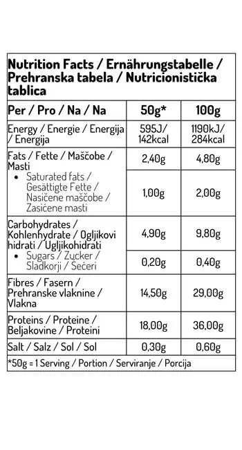 grahovi proteini, ovseni proteini, pšenični proteini, jajčni beljak, pšenične vlaknine, akacijeve vlaknine, riževi proteini, pšenična moka, psilium. Proizvedeno v obratu, kjer se uporabljajo tudi oreščki, sezam, volčji bob, jajca, mleko, oves in soja.