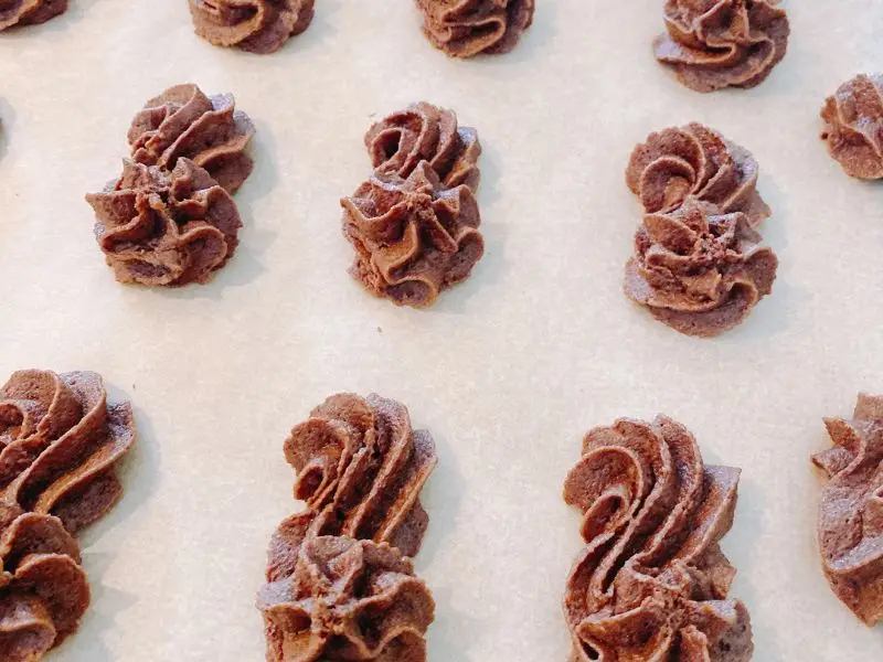 Piškote nabrizgamo na pekač, obložen s peki papirjem. Pečemo na 170 stopinj približno 15-20 minut. Pazimo, da se piškoti ne zažgejo, ker potem bodo grenki. Čas peke je odvisen od velikosti piškotov in debeline.
