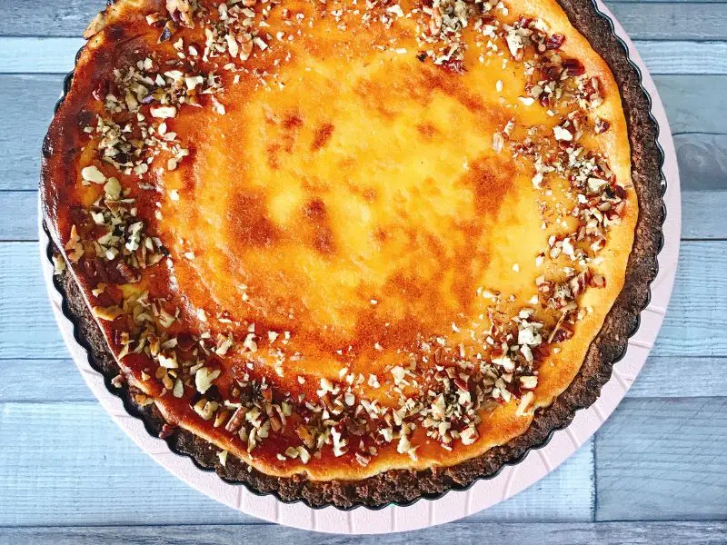 Nato kremo odstavimo, malo ohladimo ter počasi vmešamo mascarpone. Kremo zlijemo na pečeno podlago in vse skupaj pečemo še približno 40-45 minut na 180 stopinj (zadnjih 15 minut lahko temperaturo znižamo na 165-170 stopinj).