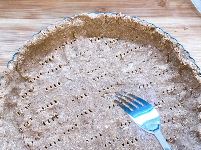 Testo naredimo tako, da zmešamo vse navedene sestavine v homogeno maso, naredimo kepo in postavimo v hladilnik za minimalno pol ure. Dobro namastimo pekač za pite (ali tortni model premera 26 cm) in testo razporedimo po pekaču v enakomernem sloju. Če imamo model za pite z valovitim robom, testo razporedimo tudi po robu. Dno prepikamo z vilicami in pečemo na 180 stopinj približno 10-15 minut (odvisno od pečice).