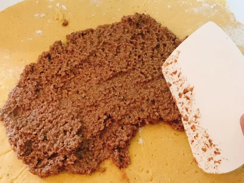 Orehov namaz razporedimo po celotni površini in s pomočjo spodnjega peki papirja nežno zavijemo v »klobaso«, tako da je ovita v peki papir. Enako ponovimo z drugim delom testa.