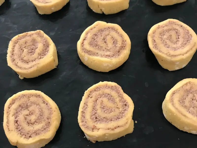 Obe klobasi (zaviti v peki papir) damo za 30-40 minut v skrinjo ali zamrzovalnik. Vzamemo ven in z ostrim nožem narežemo za prst debele rezine. Če je potrebno rahlo popravimo obliko, da je lepo okrogla. Posamezne rezine polagamo na pekač, obložen s peki papirjem.