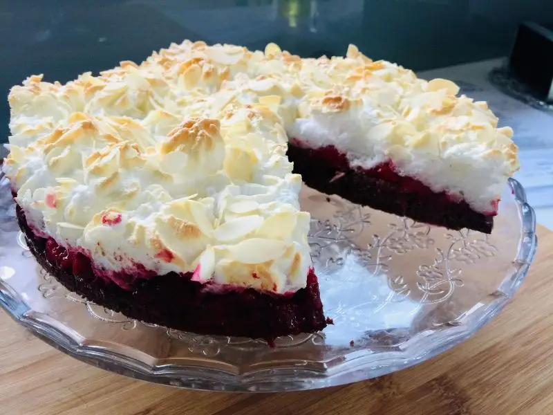 Ko je biskvit pečen nanj naložimo 200 g malin ali mešanega jagodičevja in prelijemo s sokom, ki se je natekel med odtaljevanjem. Na maline s pomočjo dresirne vrečke (ali pa z žlico) nabrizgamo sneg iz beljakov. Po vrhu lahko potresemo z mandlji v lističih. Damo nazaj v pečico na 170 stopinj cca 10 minut, oziroma dokler se ne pojavi rjava skorjica.